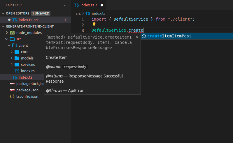 Now you can import and use the client code, it could look like this, notice that you get autocompletion for the methods: